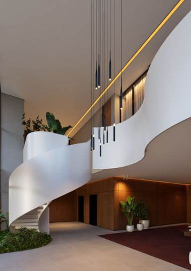 hall de entrada conta com pé-direito duplo, integração visual entre áreas internas e externas e acesso principal com fechadura por reconhecimento facial, reforçando o conceito de segurança e tecnologia desde a chegada
