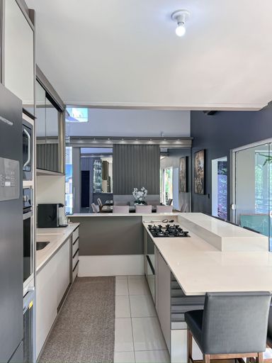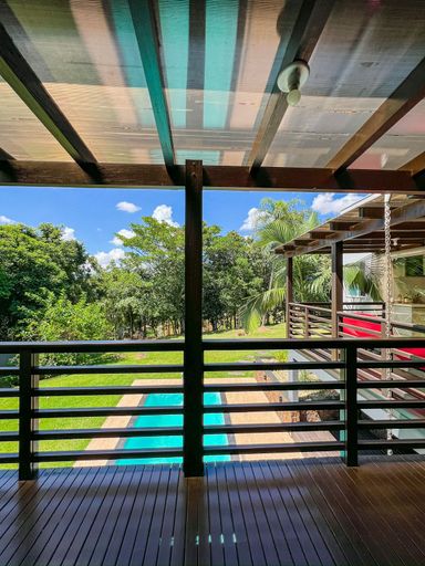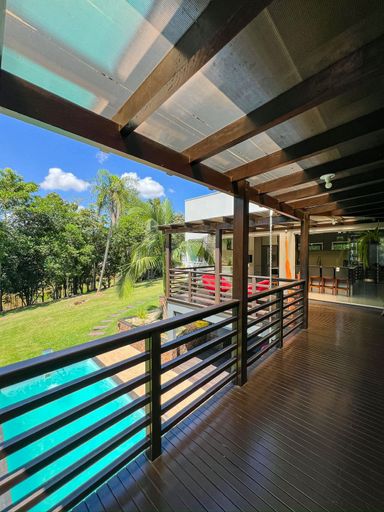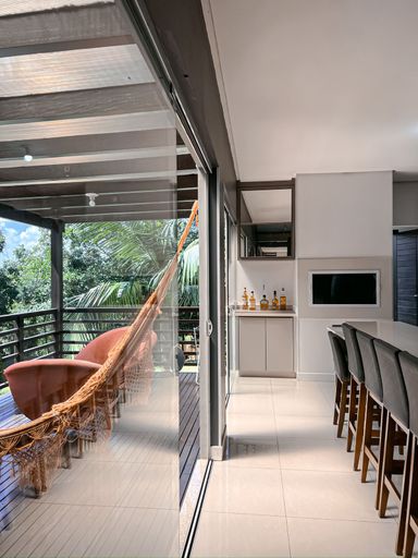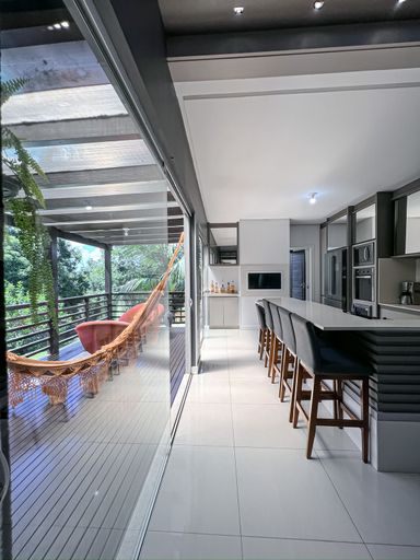 Cozinha com churrasqueira integrada ao deck, com vista para o lago